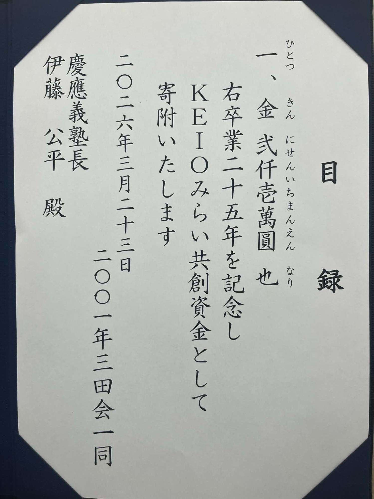そして、私たち2001年三田会による「卒業25年記念事業 寄付目録贈呈」が行われました。 寄付・名簿委員会の大西隆之委員長と、IT・広報委員会の池田祐輔委員長から伊藤塾長へ目録が贈呈されました。