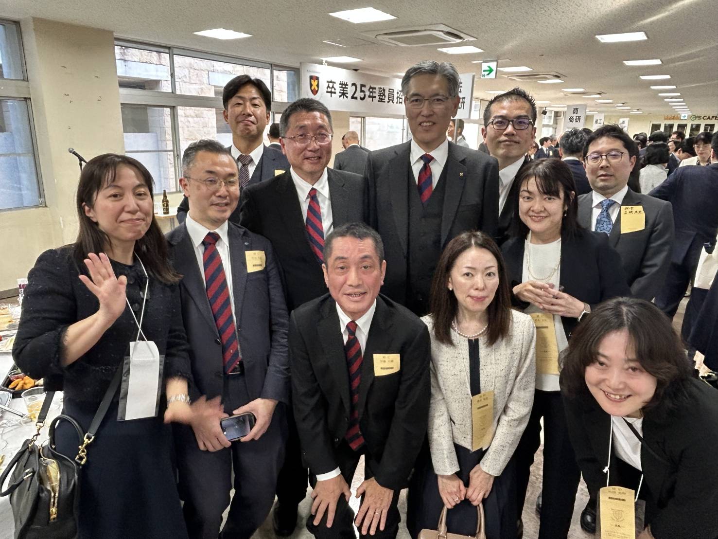 その後の懇親タイムでは、前日の「大同窓会」から連日参加された方も、この日だけ参加された方も入り交じり、至る所で笑顔の輪が広がりました。卒業以来、実に25年ぶりの再会を喜ぶ声や、近況報告で大いに盛り上がるなど、和気あいあいとしたアットホームな雰囲気に包まれました。会場内では伊藤塾長との記念写真撮影が大人気となり、順番待ちの列ができるほどの盛況ぶりでした。