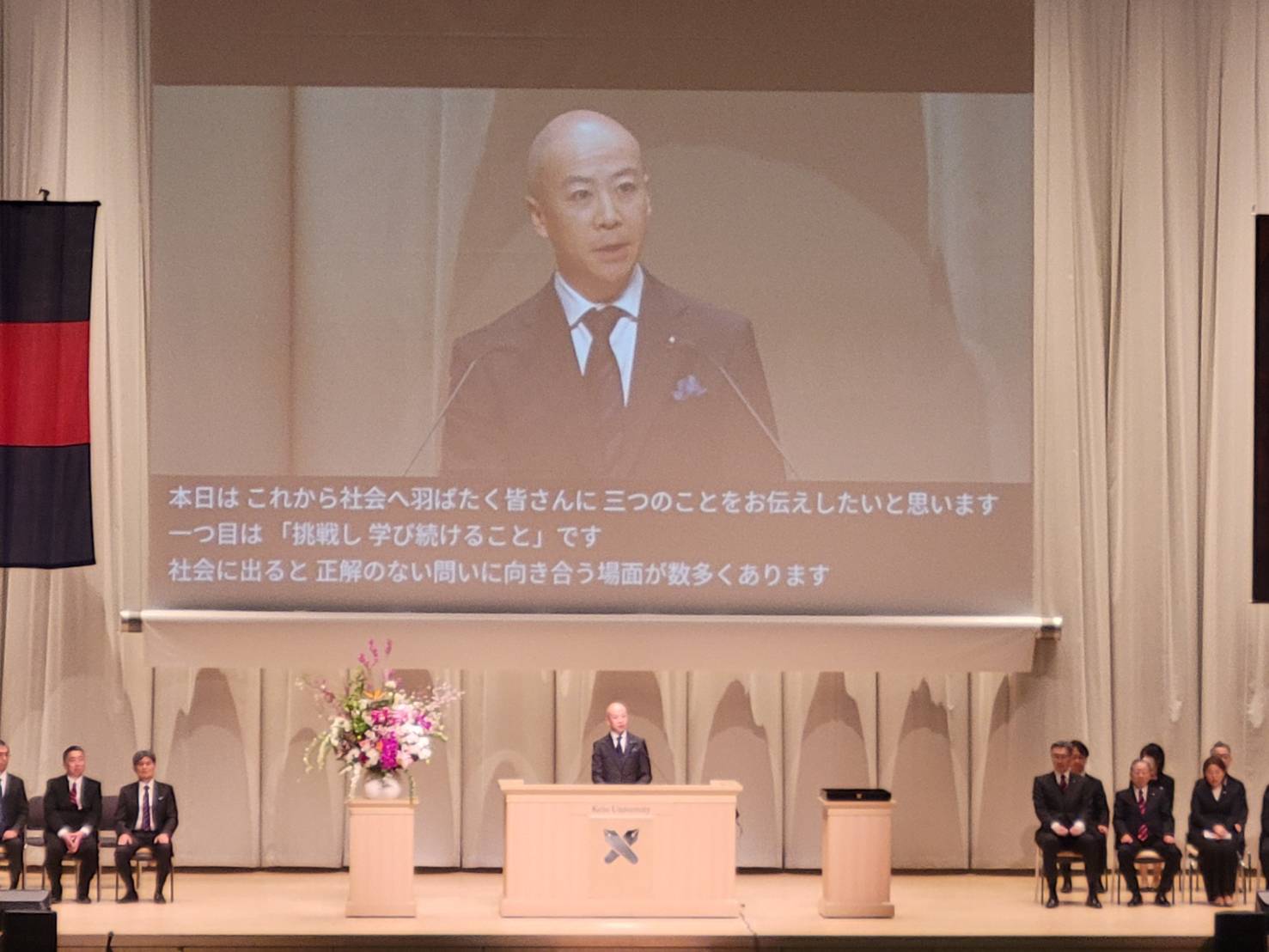 学位記授与などに続き、伊藤公平塾長からの式辞がありました。昨今の国際情勢や日本経済への厳しい見通しに触れつつ、福澤諭吉先生の「国を支えて、国に頼らず」「進まざる者は必ず退き、退かざる者は必ず進む」という言葉が贈られました。