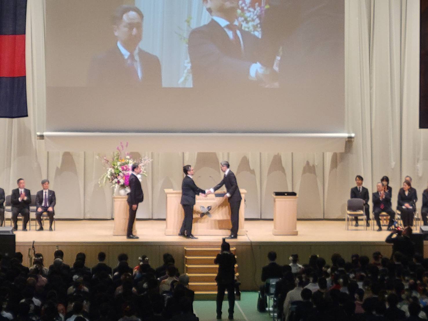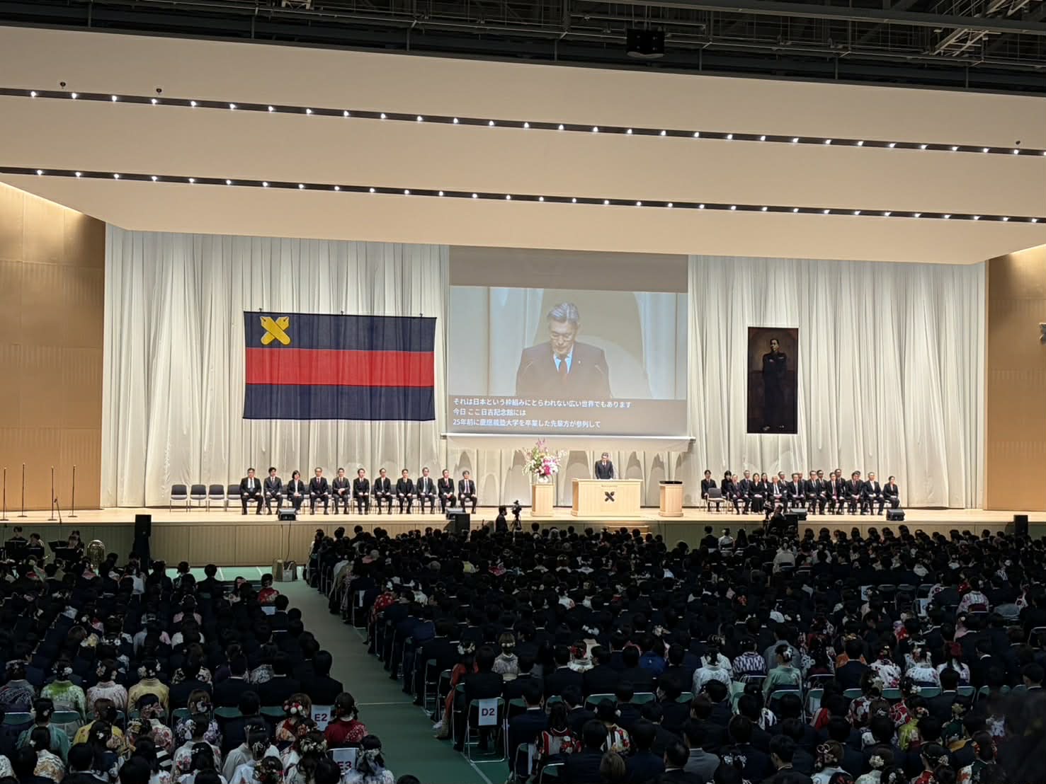 14時、満席の日吉記念館にて「若き血」のメロディと共に伊藤公平塾長が壇上へ入場され、卒業式が開式しました。私たちゼロイチのメンバーはスタンド1階席に着席。眼下に広がる約6,200名の若き卒業生たちの熱気と希望に満ちた姿を、温かい気持ちで見守らせていただきました。
